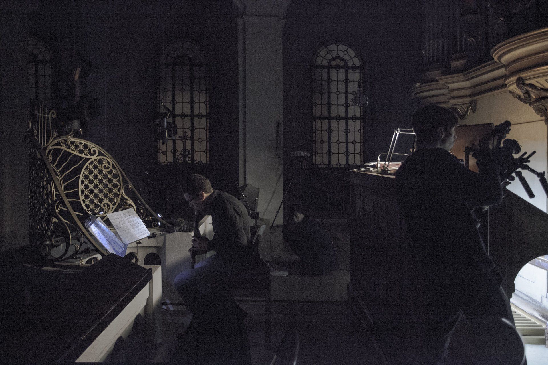 The unifying element is light and its absence. The church is turned into darkness and specific parts of it are being lit according to the flow of the performance.