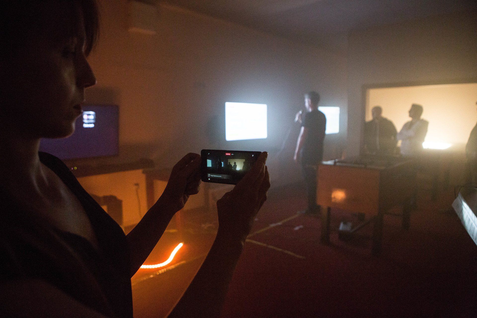 The final 'choreography' and setup respected the screens and playstations and utilized them for the projected content. The general rehearsal and the performance itself were transmitted in real time via social network.