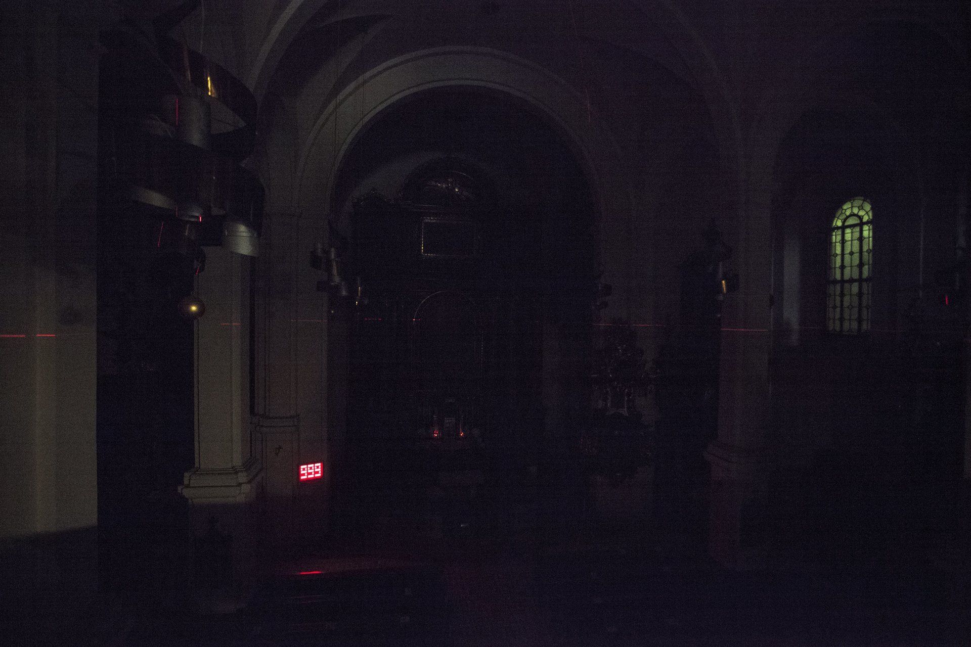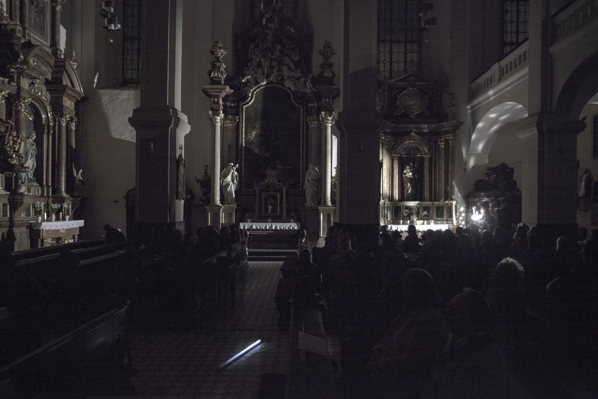 The unifying element is light and its absence. The church is turned into darkness and specific parts of it are being lit according to the flow of the performance.